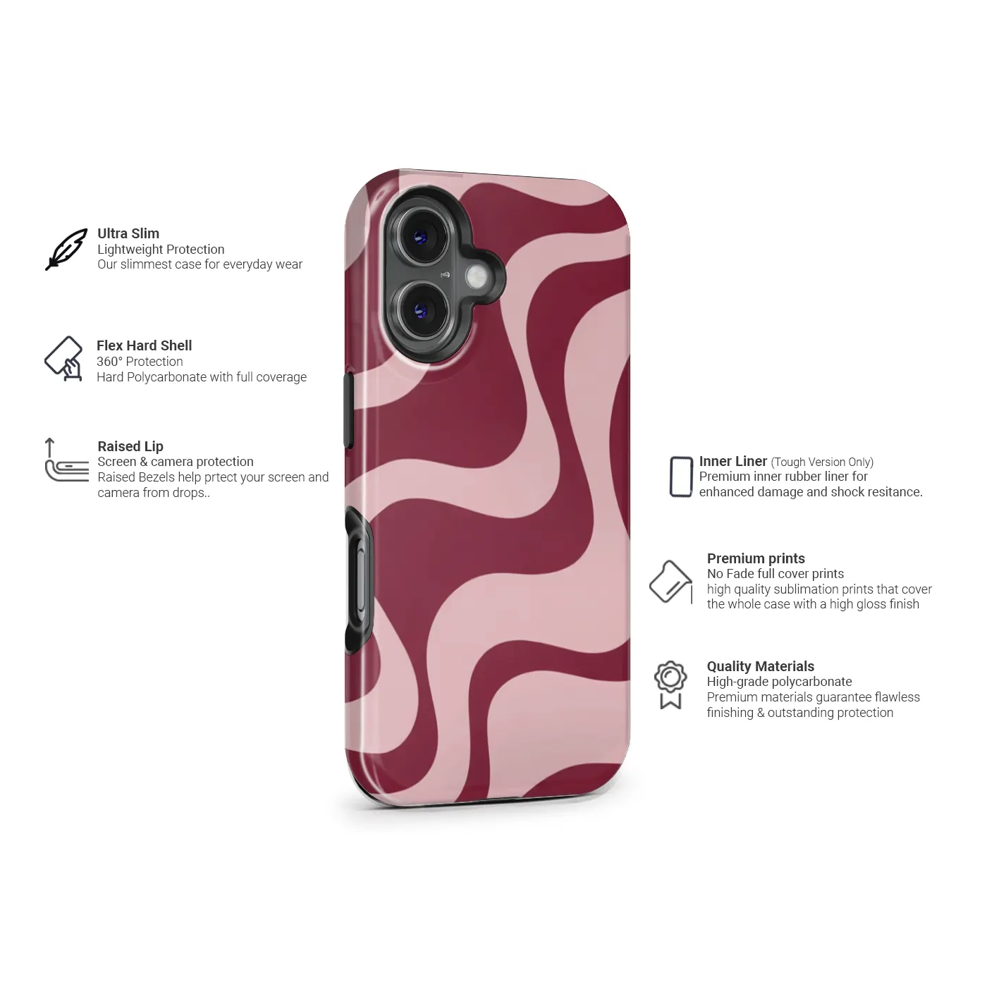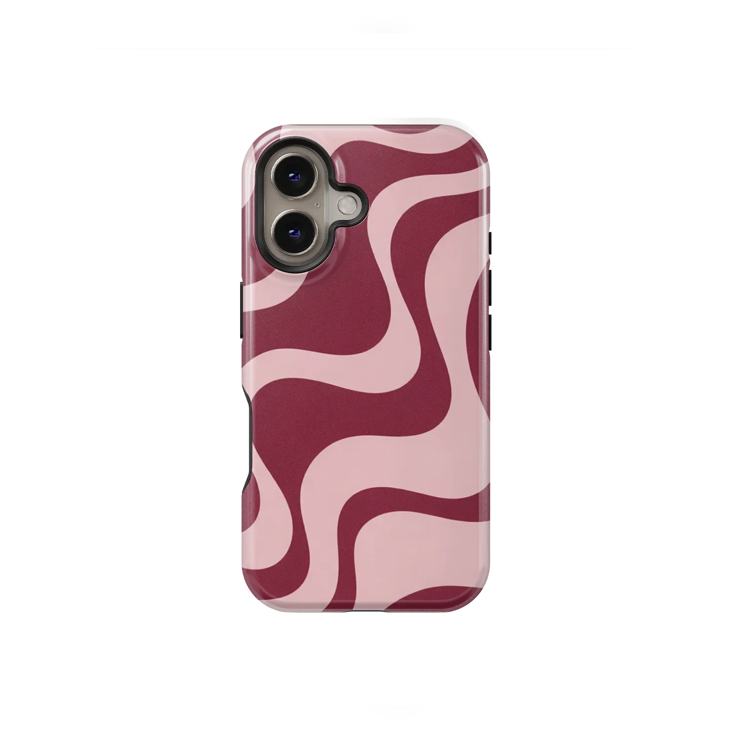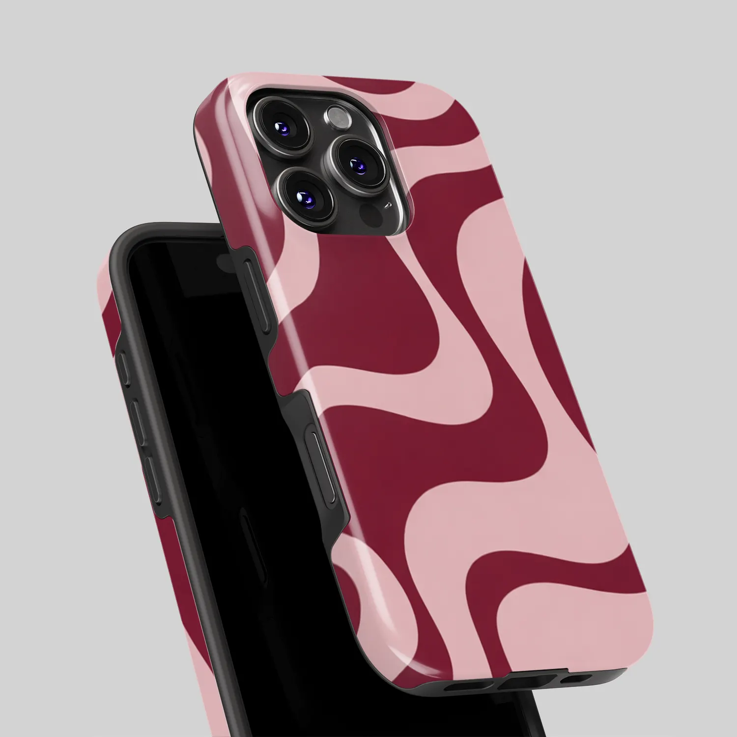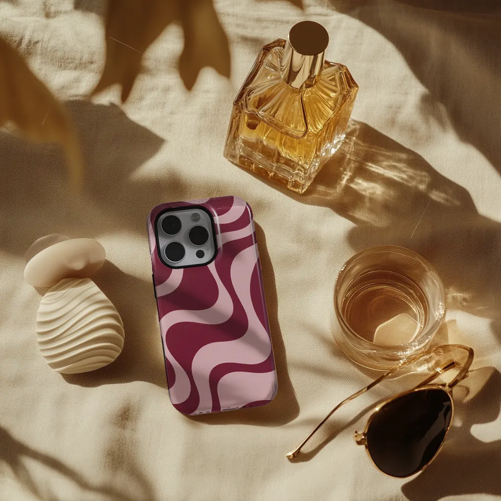 Het Blush Current hoesje draait helemaal om vloeiende lijnen. Zachte golven in blushroze en diepe wijnrode tinten creëren een rustig, retro-geïnspireerd patroon dat zowel warm als modern aanvoelt. Het is het soort ontwerp dat overal goed bij past en nooit opzichtig is. Subtiel, maar niet saai.