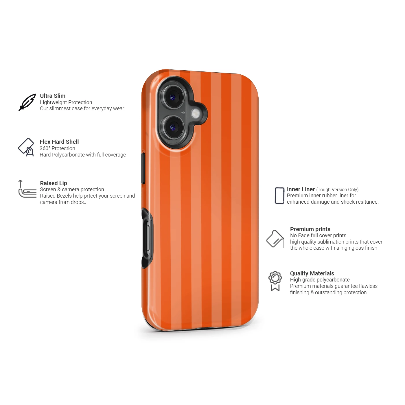 - Tough Case: Dubbellaagse constructie met een harde buitenkant en een schokabsorberende TPU-binnenvoering.