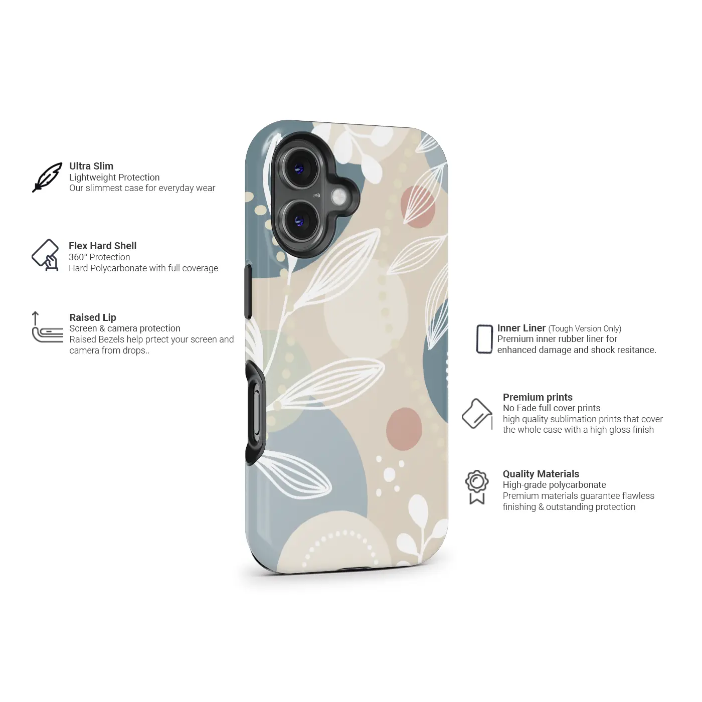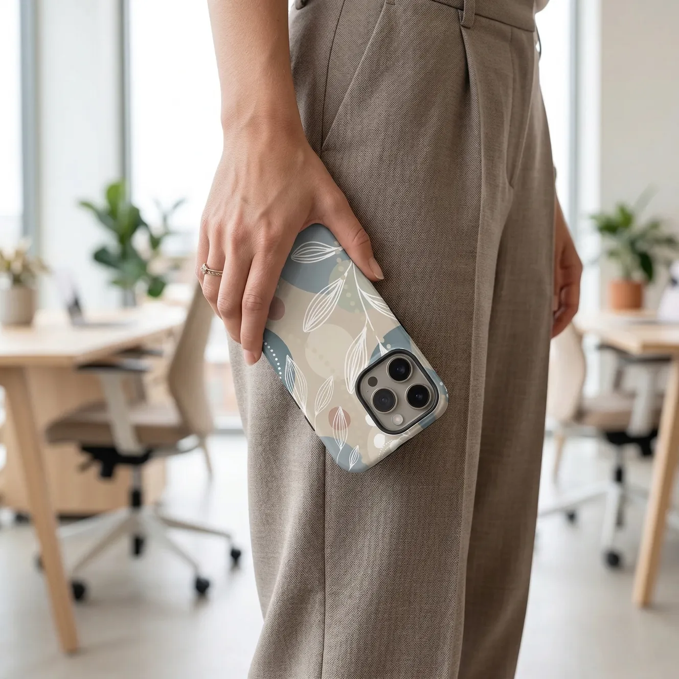 Het Whisper Flow-hoesje is stijlvol, beschermend en ontworpen voor dagelijks gebruik. Voor de Galaxy A56 geeft dit hoesje je telefoon een eenvoudige, elegante look: een lichtbeige achtergrond met cacao- en navykleurige vormen, afgemaakt met vloeiende witte bloemendetails. Het is niet schreeuwerig, maar ziet er juist van dichtbij prachtig uit.