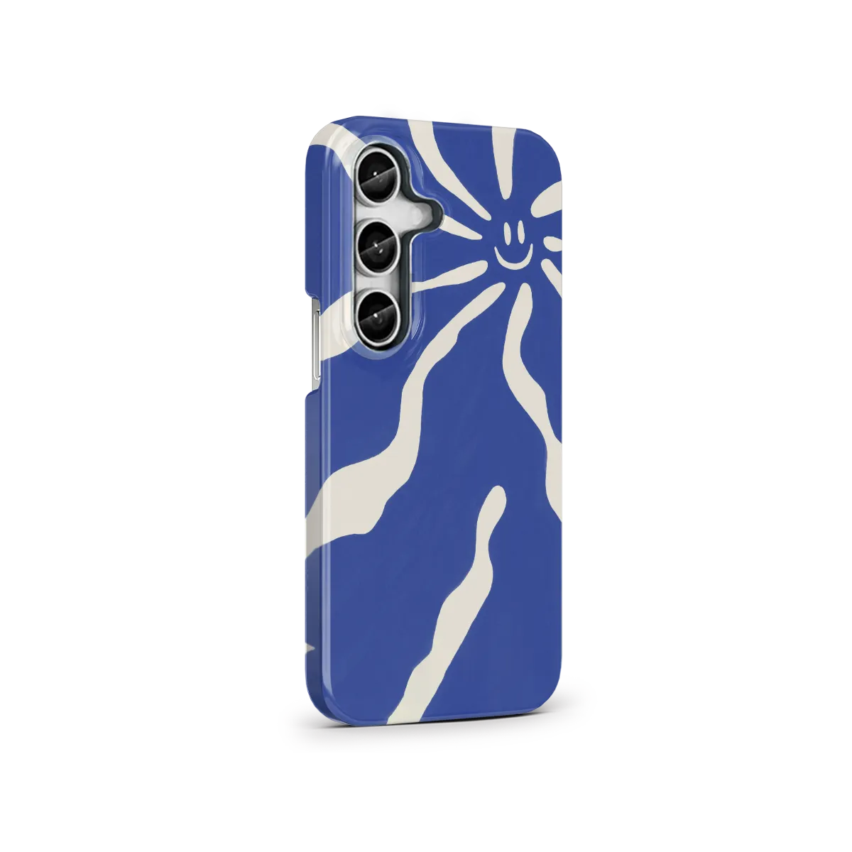 Het Blue Drift-hoesje voor de Galaxy S25 is minimalistisch, modern en een tikkeltje speels. Blauwe lijnen lopen over een zachte gebroken witte achtergrond als snelle schetsen, afgewerkt met een kleine smiley in de hoek. Het is het soort ontwerp dat fris aanvoelt zonder al te veel moeite te doen.