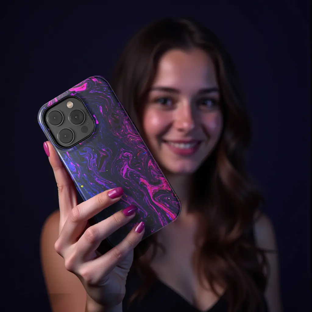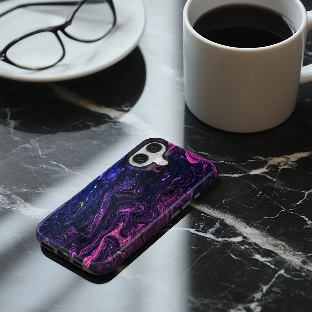 Cyberpunk Melt maakt van de S25 Ultra een statement piece. Felroze en dieppaars kronkelen over een zwart oppervlak en gloeien als vloeibaar neon in het licht.